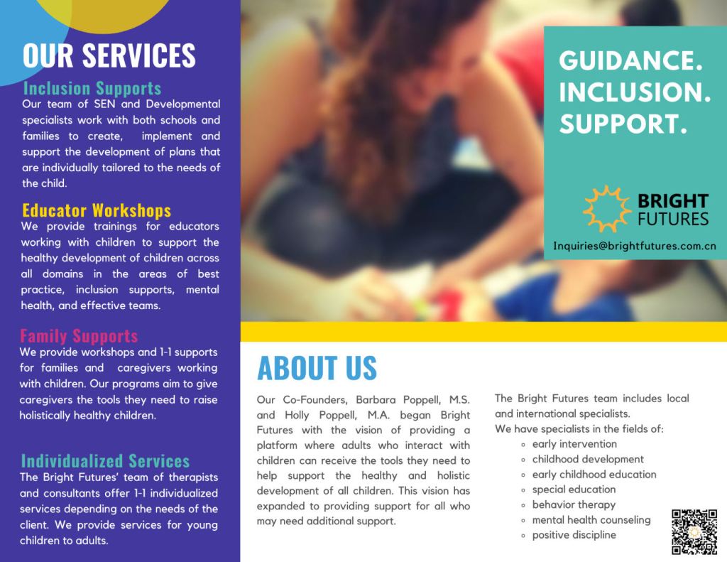At Bright Futures we aim to create an accepting and inclusive society through advocacy, guidance, prevention, and support. We work with schools, families, students, adults and the community to support their needs of individuals.