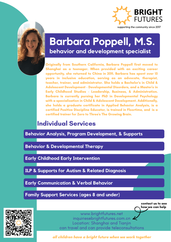 Barbara Poppell, M.S., is a dedicated behavior and development specialist with a rich background in supporting children and families. Originally from Southern California, Barbara began her career in Shanghai, where she honed her skills over 15 years in various educational and administrative roles. She holds a Bachelor’s in Child and Adolescent Development and a Master’s in Early Childhood Studies, and is currently seeking a Ph.D. in Developmental Psychology.