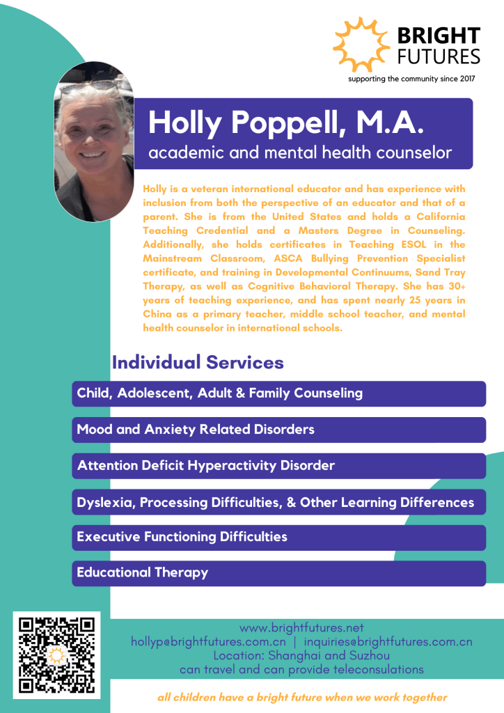 In 2017 Bright Futures was started by mother-daughter team who have spent over 2 decades in China. Their commitment to making sure the community has what it needs to support children and the expat community is what drove them to start their own company. Over the years, they have worked with countless individuals helping them meet their individual needs as well as with international and bilingual schools throughout China.